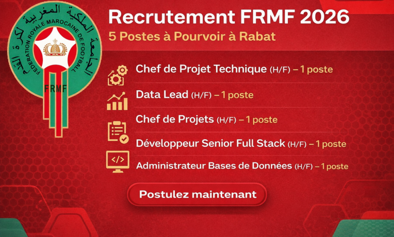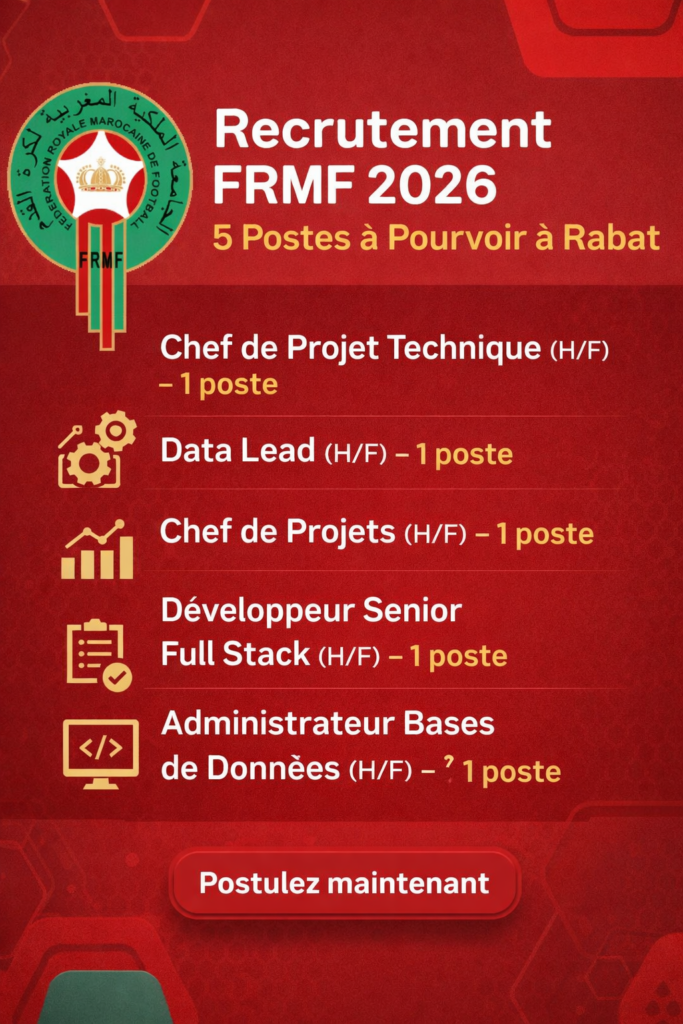 La Fédération Royale Marocaine de Football recrute plusieurs postes IT et data à Rabat, en CDI. Les postes s’adressent à des profils confirmés Bac+5 et plus, disposant de 5 à 8 ans d’expérience, souhaitant évoluer dans un environnement structuré, institutionnel et orienté performance.