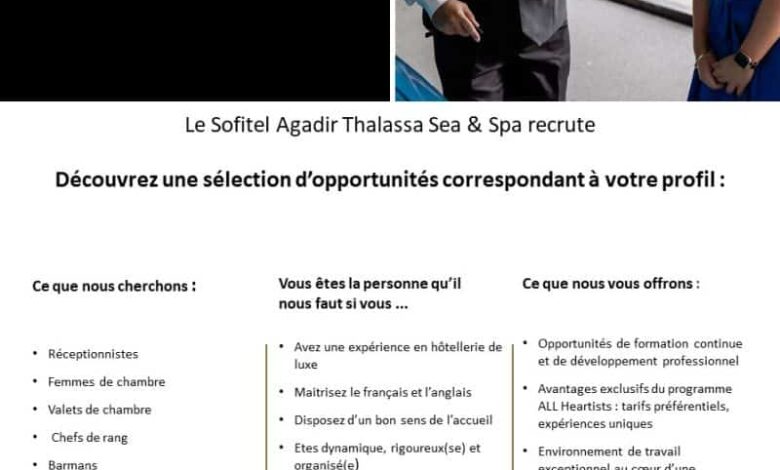 Le Sofitel Agadir Thalassa Sea & Spa recrute plusieurs profils en hôtellerie à Agadir, pour des postes dont le type de contrat n’a pas été précisé. Les postes s’adressent à des candidats ayant une expérience en hôtellerie de luxe, maîtrisant le français et l’anglais, avec un bon sens de l’accueil, de la rigueur et de l’organisation.