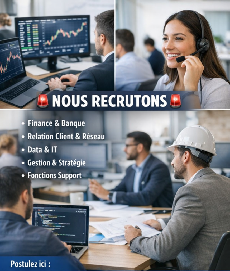 Cette opportunité exceptionnelle s’adresse à des profils bancaires variés : conseillers clientèle, chargés d’affaires, gestionnaires de comptes, directeurs d’agence, analystes crédit, profils digitaux, et bien d’autres postes dans les domaines commercial, risques, finance et support.